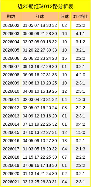 双色球第2026021期开奖,红球:03、13、25、26、30、31,蓝球:04。其中红球012路比为2:3:1,蓝球开出1路号码。