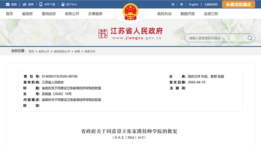 近日,江苏省东说念主民政府网站发布《省政府对于本心诞生张家港技师学院的批复》。