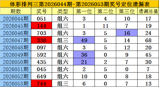 开奖总结:陈设三第2026053期奖号为:744,列位号码遗漏值分离为6、0、7,遗漏总值为13。