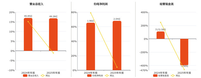 公司买卖总收入为49.28亿元,较客岁同解释期买卖总收入减少5704.02万元,同比拟客岁同时下落1.14%。归母净利润为2.04亿元。计较行径现款净流入为-2.60亿元,在已表示的同行公司中排行第100,较客岁同解释期计较行径现款净流入减少3.32亿元,同比拟客岁同时下落462.23%。