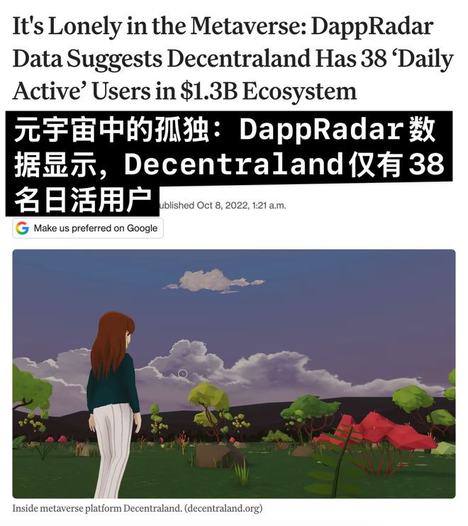2022年10月,DappRadar的数据自满,Decentraland的日活链上交互用户一度只须38个,TheSandbox好小数,522个。