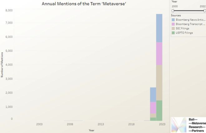 有媒体统计了SEC备案、专利苦求、财报电话会、彭博新闻报说念里“metaverse”出现的次数。2020年之前这个词一年不到100次,截至2021年涨到1300屡次,2022年飙到近8000次。