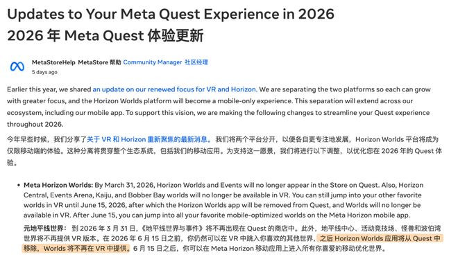 上周Meta晓喻,HorizonWorlds(地平线全国)将在QuestVR头显上绝对下架。