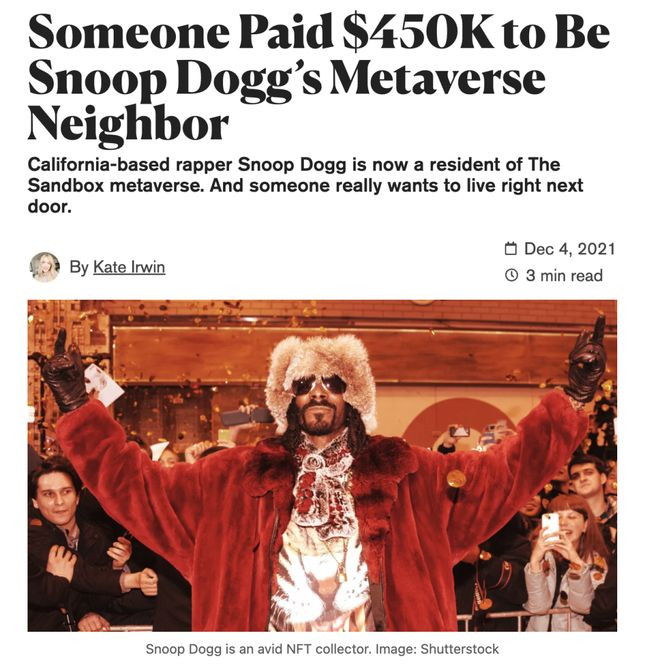 2021年,有东说念主花45万好意思元在TheSandbox买了一块捏造地盘,主见只须一个:当说唱歌手SnoopDogg的邻居。那时SnoopDogg还在推特上真贵摄取,发了句Won'tyoubemyneighbor。