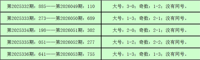 则,3D第2025337期开出奖号:876,其大小比为3:0,奇偶比为1:2,012路比为1:1:1,与3D第2026054期奖号可能莫得同号。