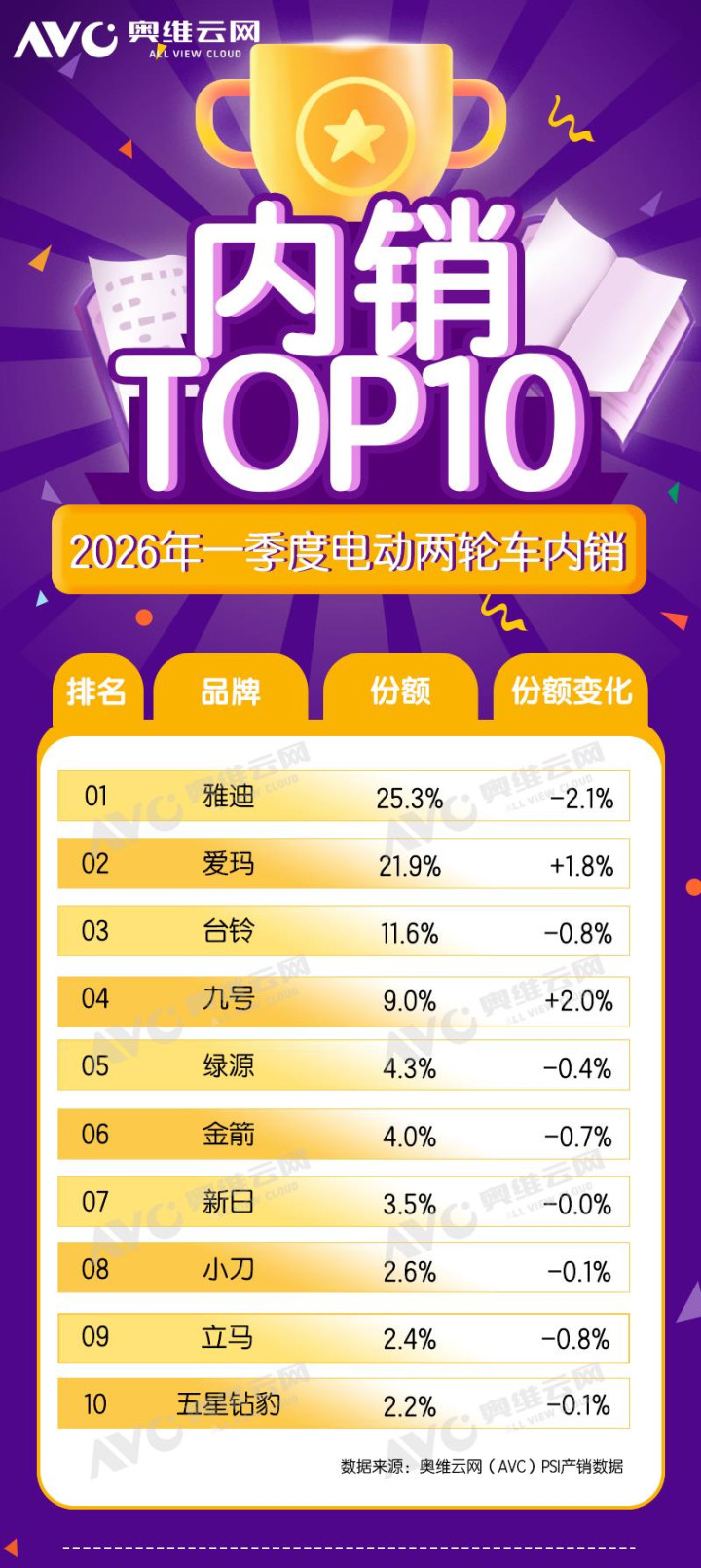 凭据奥维云网(AVC)数据败露,2026年第一季度中国电动两轮车(电动自行车、电动轻视摩托车、电动摩托车)国内销量1209.51万辆,同比下滑17.1%,前十大品牌商场份额统统达到86.8%。传统大牌里唯有爱玛结束份额增长,九号、小牛等智能新势力施展更亮眼,商场份额鉴识普及2.0个、0.5个百分点。已往行业时势会发生什么新变化,咱们将捏续贵重。