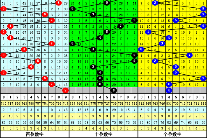 百位走势:近10期在0-7之间出号,跨度为8点,出号相比溜达,上期奖号为7,飞腾1点,本期看好该位飞腾。另外近10期该位大小比为4:6,大号较冷,本期介怀大号回补,温煦号码9。