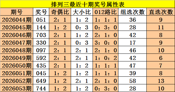 上期记忆:体彩摆设三第2026053期奖号:744,奇偶比1:2,大小比1:2,012比0:3:0。