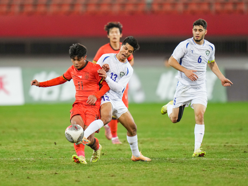 {jz:field.toptypename/}2025年11月18日,中国队球员蒯纪闻(前左)和乌兹别克斯坦球员朱马耶夫·阿西尔别克在比赛中拼抢。\n 当日,在四川成齐举行的2025CFA中国之队·熊猫杯国际足球锦标赛中,中国U22国度男人足球队主场0比0战平乌兹别克斯坦U22国度男人足球队。\n 新华社记者 王曦 摄